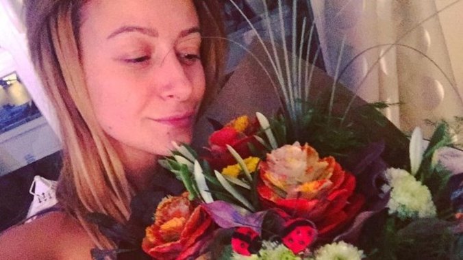 Ona je dobila veliki buket cveća sa kojim je pozirala bez trunke šminke, a budući da joj je emotivni partner rekao da je voli, ona je imala poruku za njega.