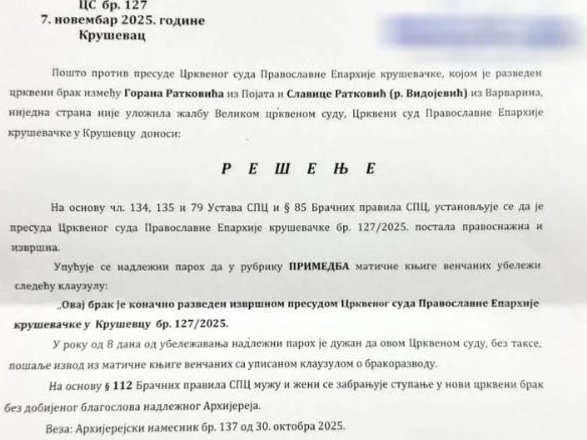 - Ako je po tom papiru i sa pogrešnim mojim prezimenom, onda mi još nismo crkveno razvedeni. Da se razumemo, ja sam zaista srećna što se i to desilo, pa tako od srca Ani Nikolić poklanjam ili prepuštam prezime Ratković. Nadam se da će sa njim zaista biti srećna, ako do venčanja uopšte i dođe. Jako sam razočarana i u crkvu jer su dali razvod bez da smo oboje bili tu i da me uopšte nisu obavestili da smo razvedeni - rekla je Slavica Coka Ratković.