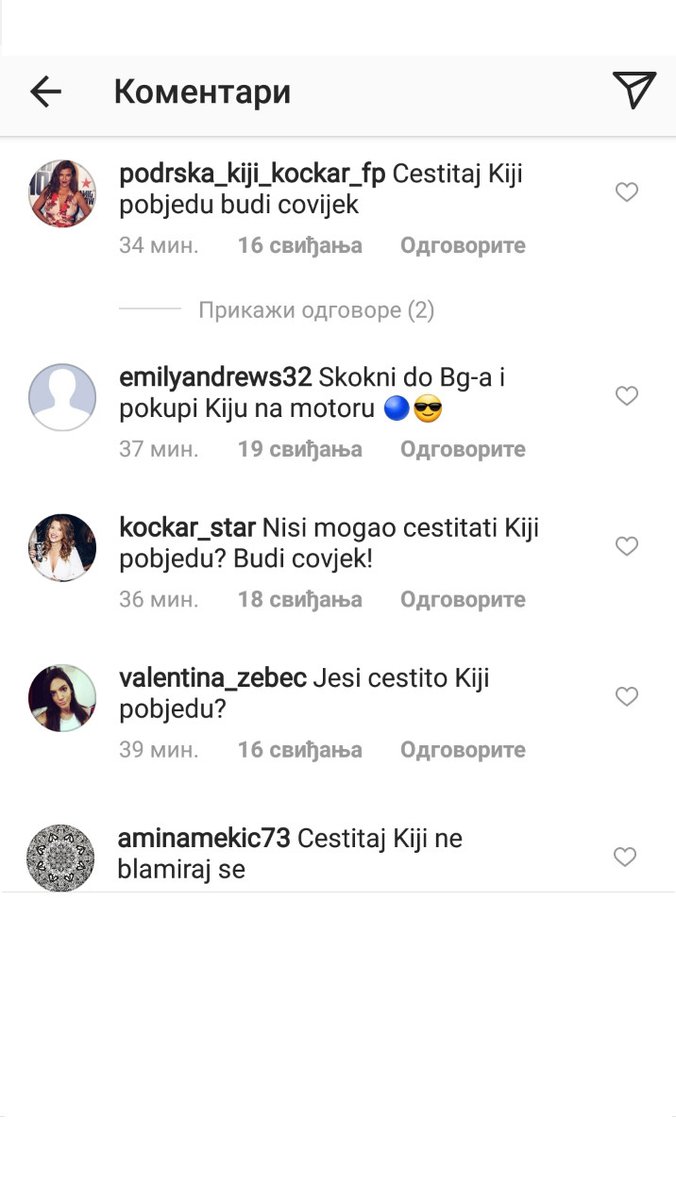Naime, ispod jedne fotografije njegovi pratioci su ostavljalji komentare poput "Nisi mogao čestitati Kiji pobedu? Budi čovek!", "Čestitaj Kiji, ne blamiraj se" i slično, a da li će se on oglasiti ovim povodom ostaje nam da vidimo.