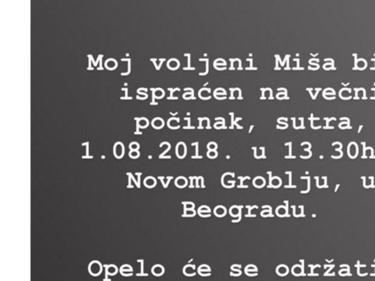 - Moj voljeni Miša biće ispraćen na večni počinak, sutra, 1.08.2018. u 13.30 časova na Novom Groblju, u Beogradu.