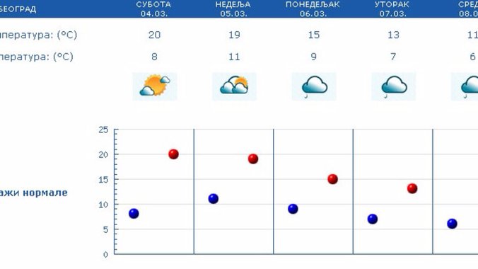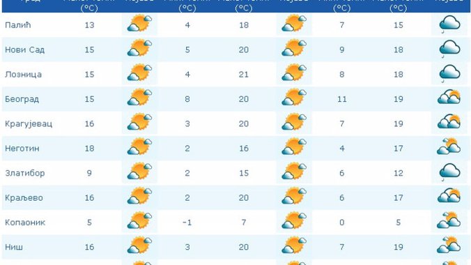 Jutarnja temperatura od nula do osam stepeni najviša dnevna od 16 do 21 stepena. U toku noći na jugozapadu, zapadu i severu Srbije naoblačenje, ponegde sa slabom kišom.