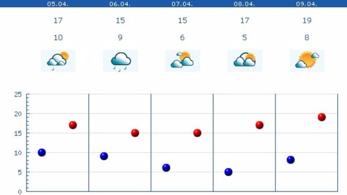Na visokim planinama sneg. Vetar slab i promenljiv. Najniža temperatura od pet do 10, najviša dnevna od 15 do 20.