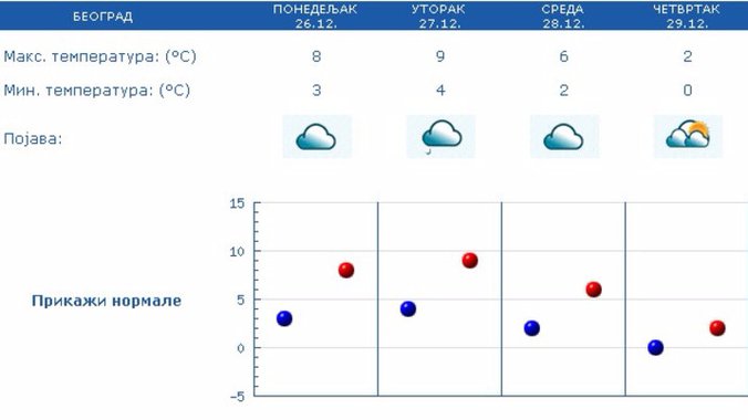 U Beogradu će biti umereno i potpuno oblačno, malo toplije, povremeno sa slabom kisom. Vetar slab i umeren, zapadni, severozapadni, u toku noći u pojačanju. Jutarnja temperatura oko 3 stepena, najviša dnevna oko 8 stepeni.