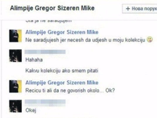 Miloš se na svim društvenim mrežama predstavlja pod imenom Alimpije Gregor Sizeren Mike, i to uopšte i ne krije. U skandaloznoj prepisci sa devojčicom, koja datira iz 2014. godine, vidi se da Miloš veoma perfidno i iskusno zavodi devojčicu i "navlači" je da mu pošalje svoje gole slike. Informer je objavio detalje prepiske: