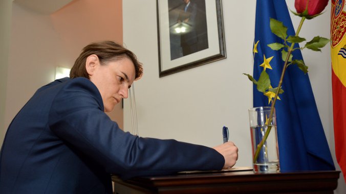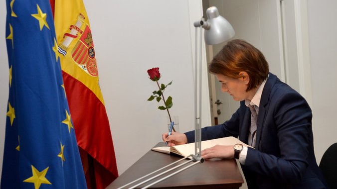 Premijerka Srbije Ana Brnabić upisala se danas u Knjigu žalosti u Ambasadi Španije povodom terorističkih napada koji su se dogodili u toj zemlji i istakla da u Srbiji imaju saveznika u borbi protiv onih koji hoće da sruše vrednosti na kojima je izgrađen moderan svet.