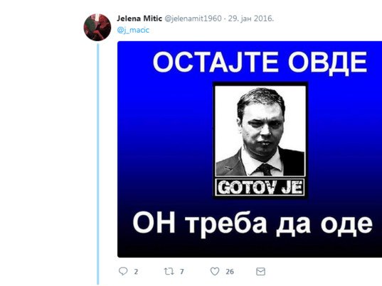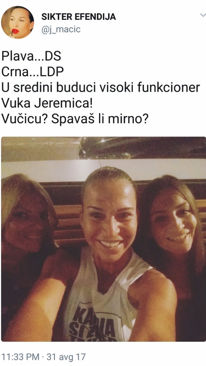 Ona je na svom Tviter nalogu objavila fotografiju sa dve drugarice ispod koje je napisala "Plava DS, Crna LDP, U sredini budući visoki funkcioner Vuka Jeremića. Vučiću? Spavaš li mirno?"