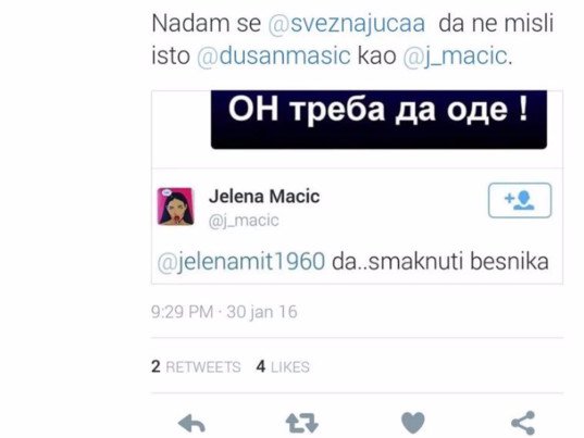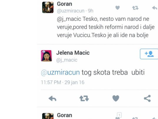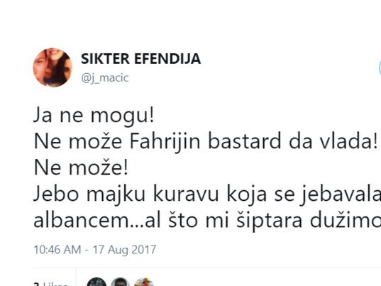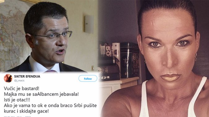 - Jebo majku kuravu koja se jebavala sa Albancem...al što mi šiptara dužimo?! Lom!- jedan je u nizu bolesnik tvitova novoizabrane visoke funkcionerke Vuka Jeremića.