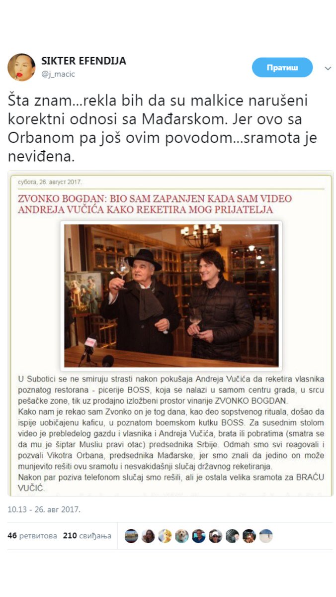 Maćić je objavila i tekst o tome kako je Vučićev brat Andrej reketirao prijatelja Zvonka Bogdana i napisala "rekla bih da su malkice narušeni korektni odnosi sa Mađarskom. Jer ovo sa Orbanom, pa još ovim povodom...Sramota je neviđena"