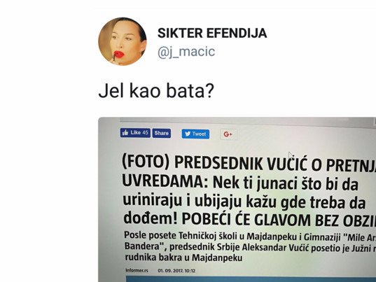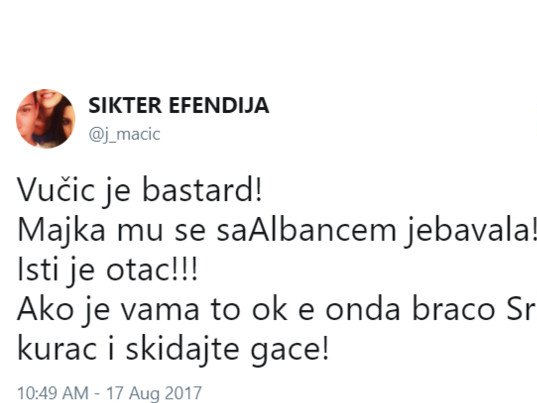 - Vučić je đubre. Majka mu se sa Albancem j.....! Isti je otac! - napisla je Maćić.