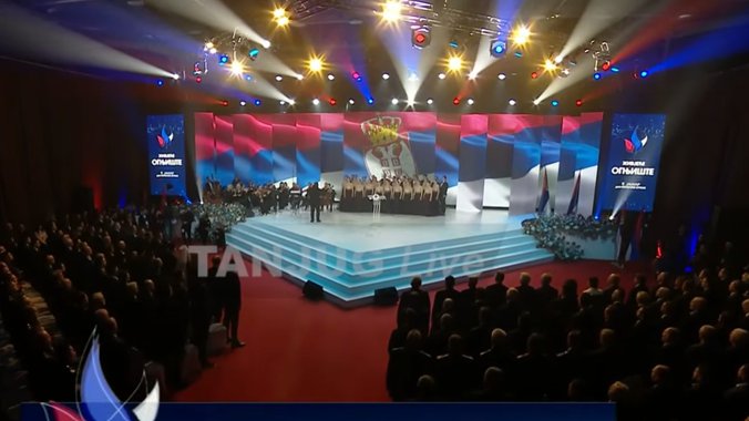 Skup je počeo intoniranjem himni RS i Srbije, a očekuju se obraćanja patrijarha Porfirija, Macuta, Ane Trišić Babić i Dodika.