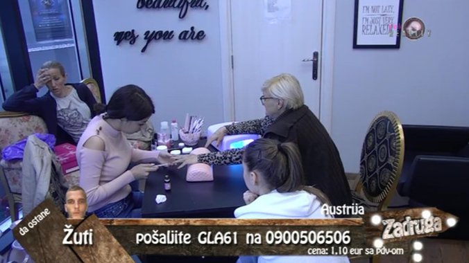 Nedelja jutro je vreme kada ukućani rijaliti programa koji obožava ceo Balkan, a i šire, "Zadruga", odlaze u salon za ulepšavanje koji se nalazi u okviru luskuznog imanja u blizini Beograda kako bi negovali svoj fizički izgled.